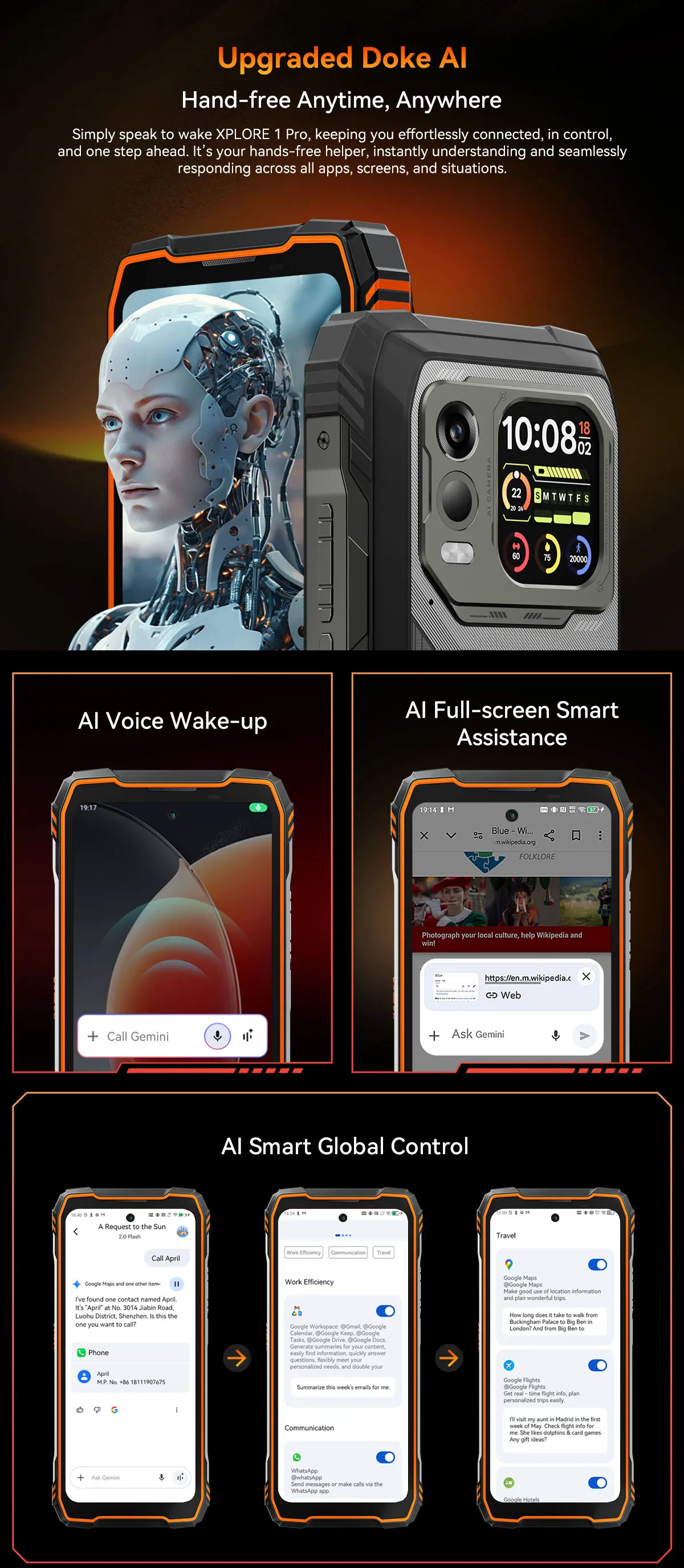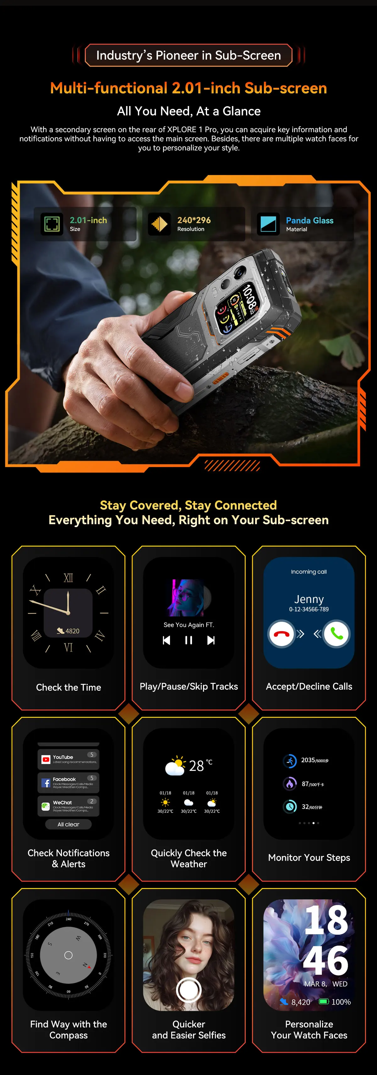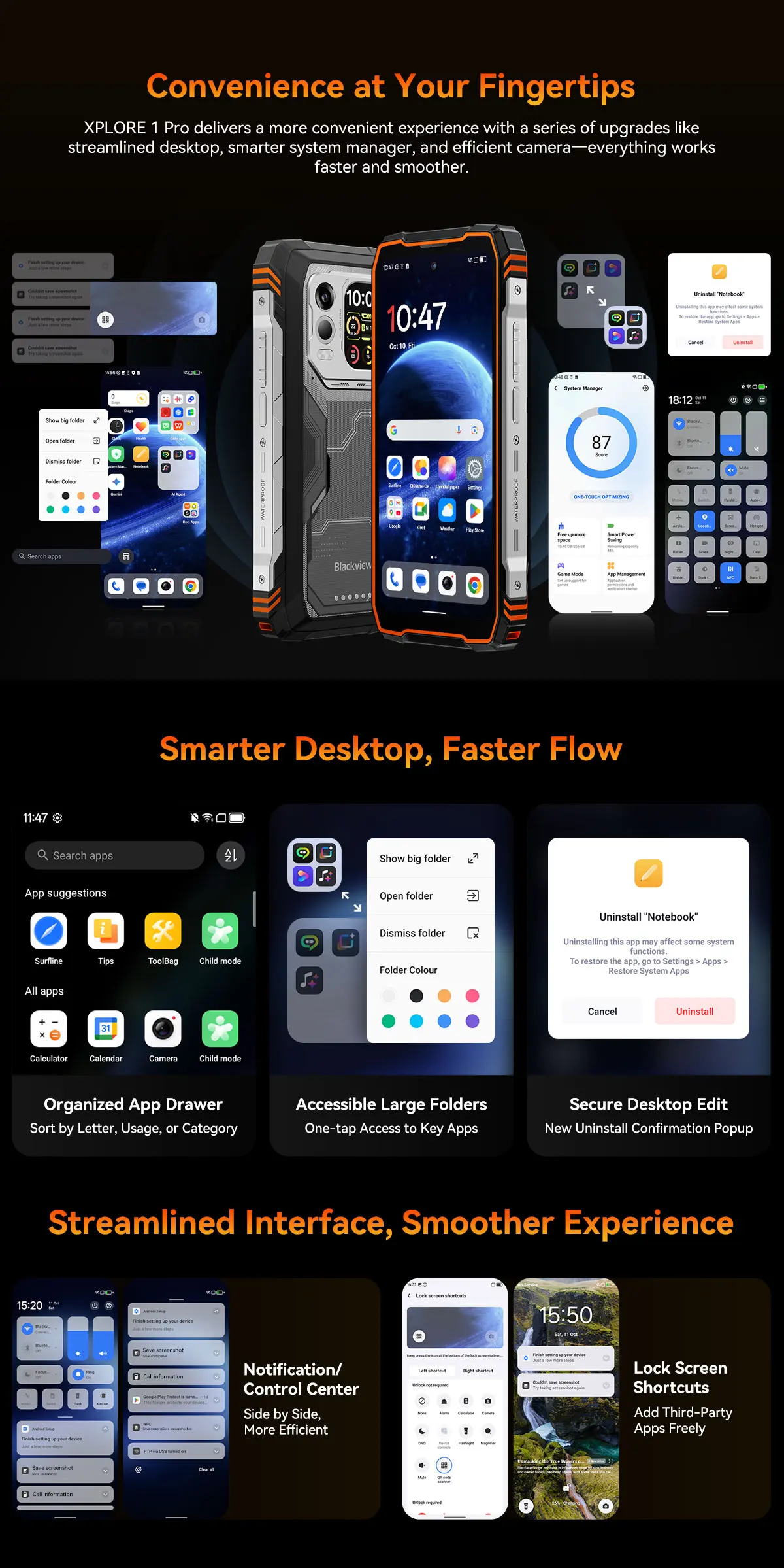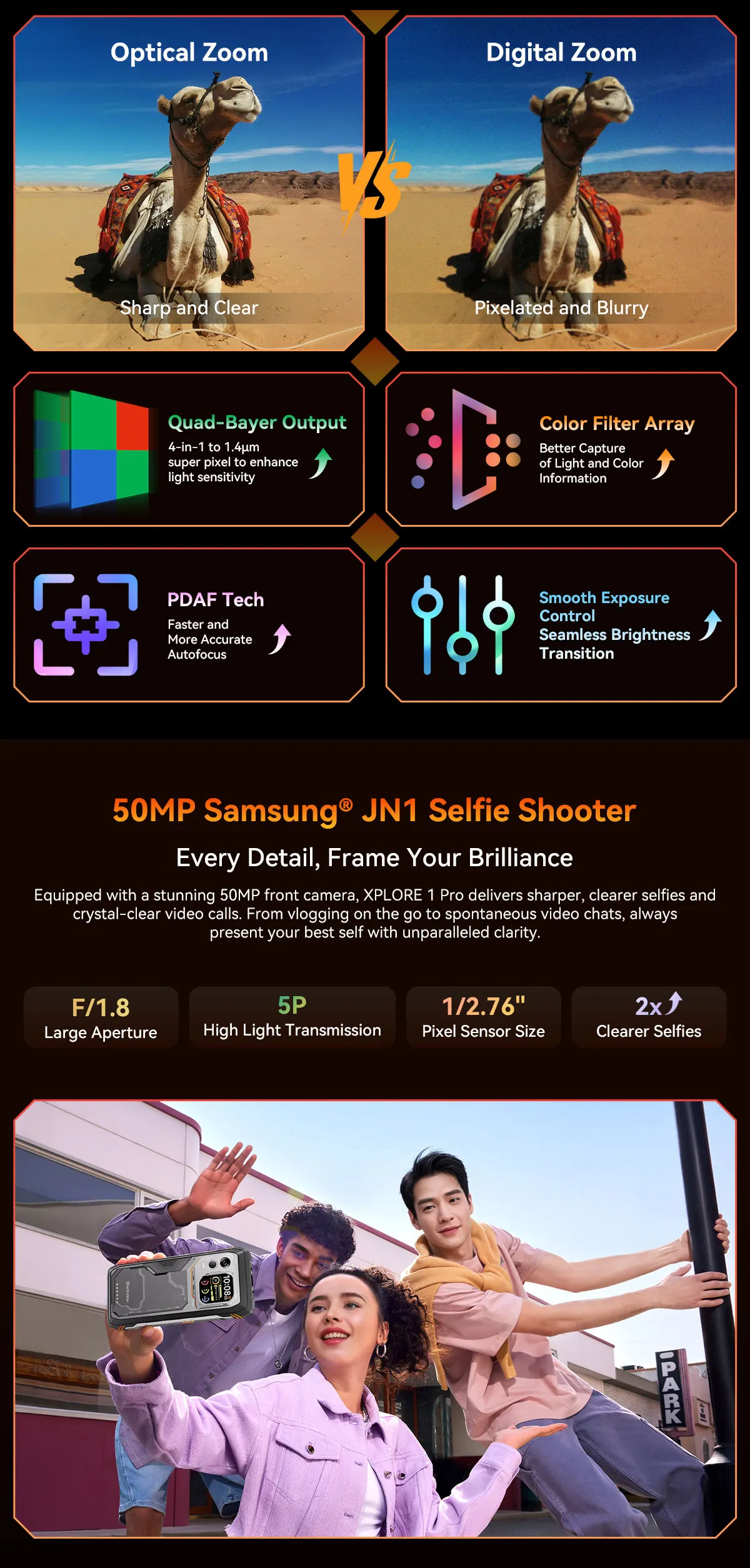 Blackview Xplore 1 Pro Portocaliu: Telefon rugged 5G, DokeOS 5.0 bazat pe Android 15. Are procesor Dimensity 7050, 16GB + 32GB RAM extensibili si 512GB ROM. Ecran principal 6.78" FHD+ 120Hz si ecran secundar 2.01". Camere puternice: 64MP + 20MP Night Vision (spate), 50MP (fata). Baterie 20000mAh cu incarcare 55W. Include camera termica FLIR, NFC, Wi-Fi 6 si protectie IP68/IP69K.