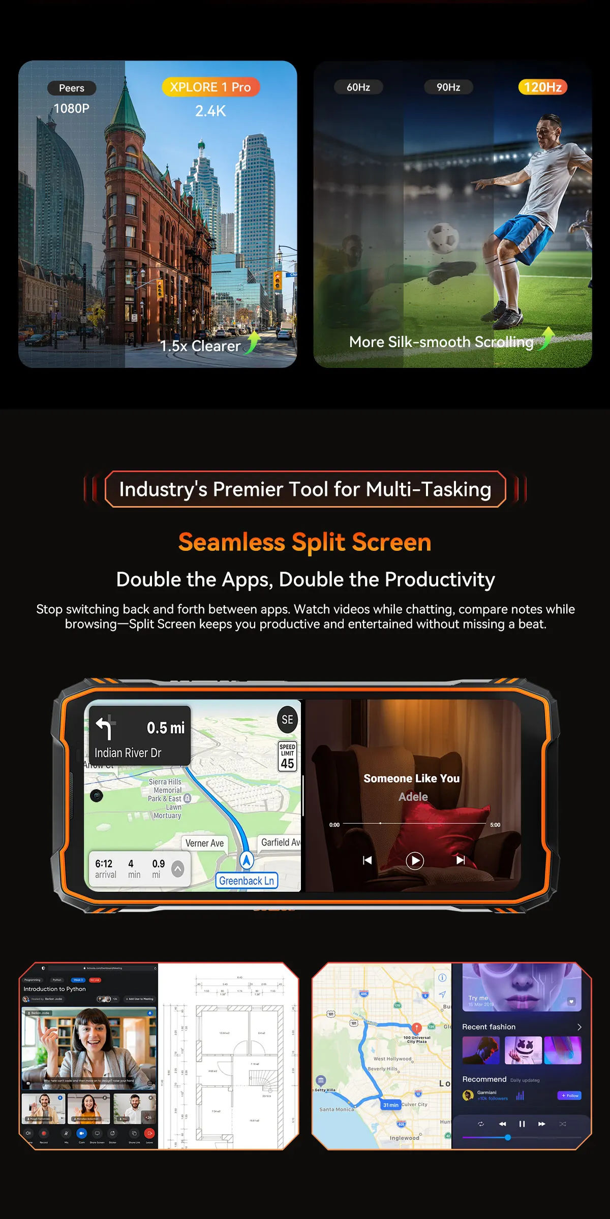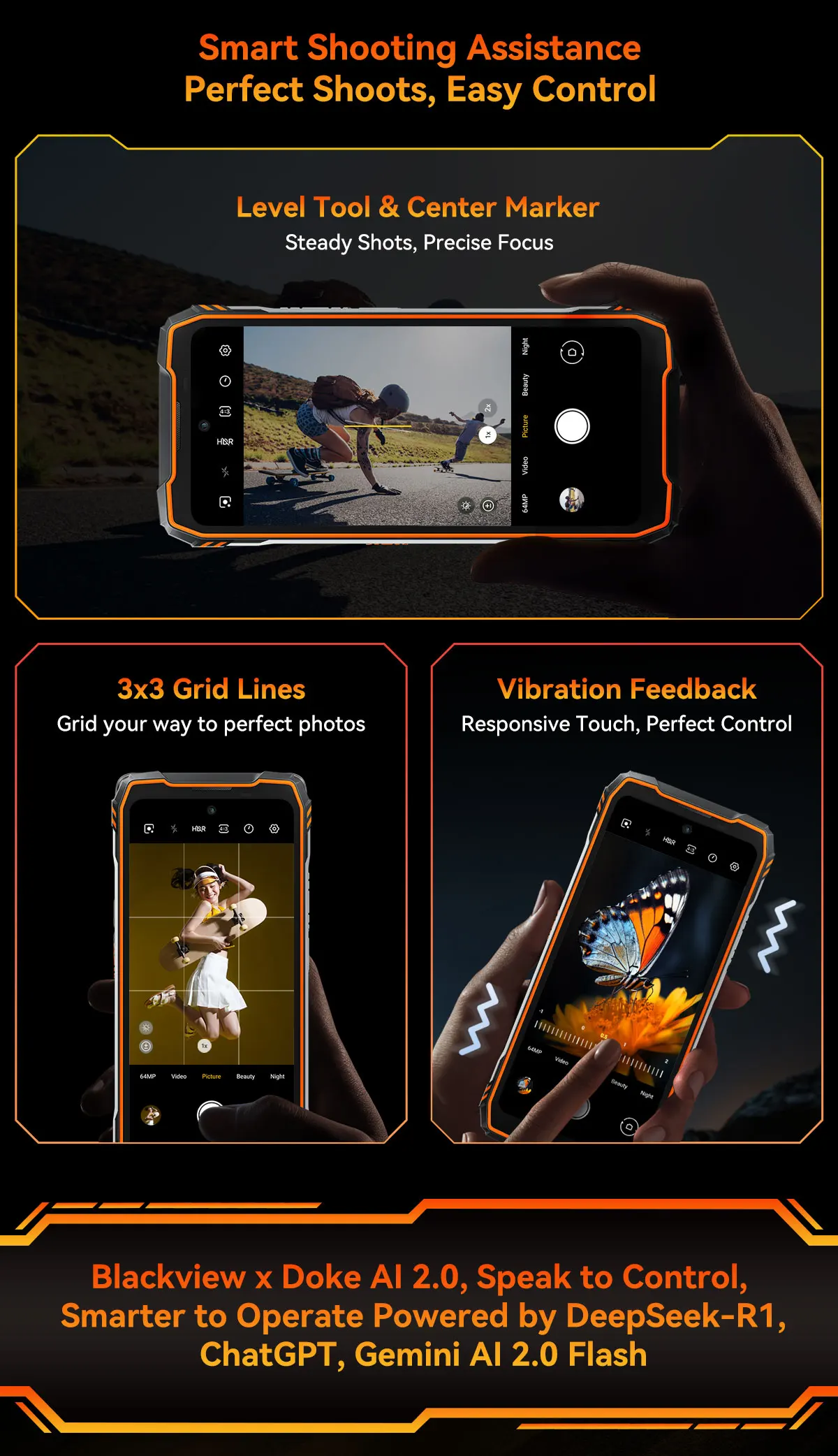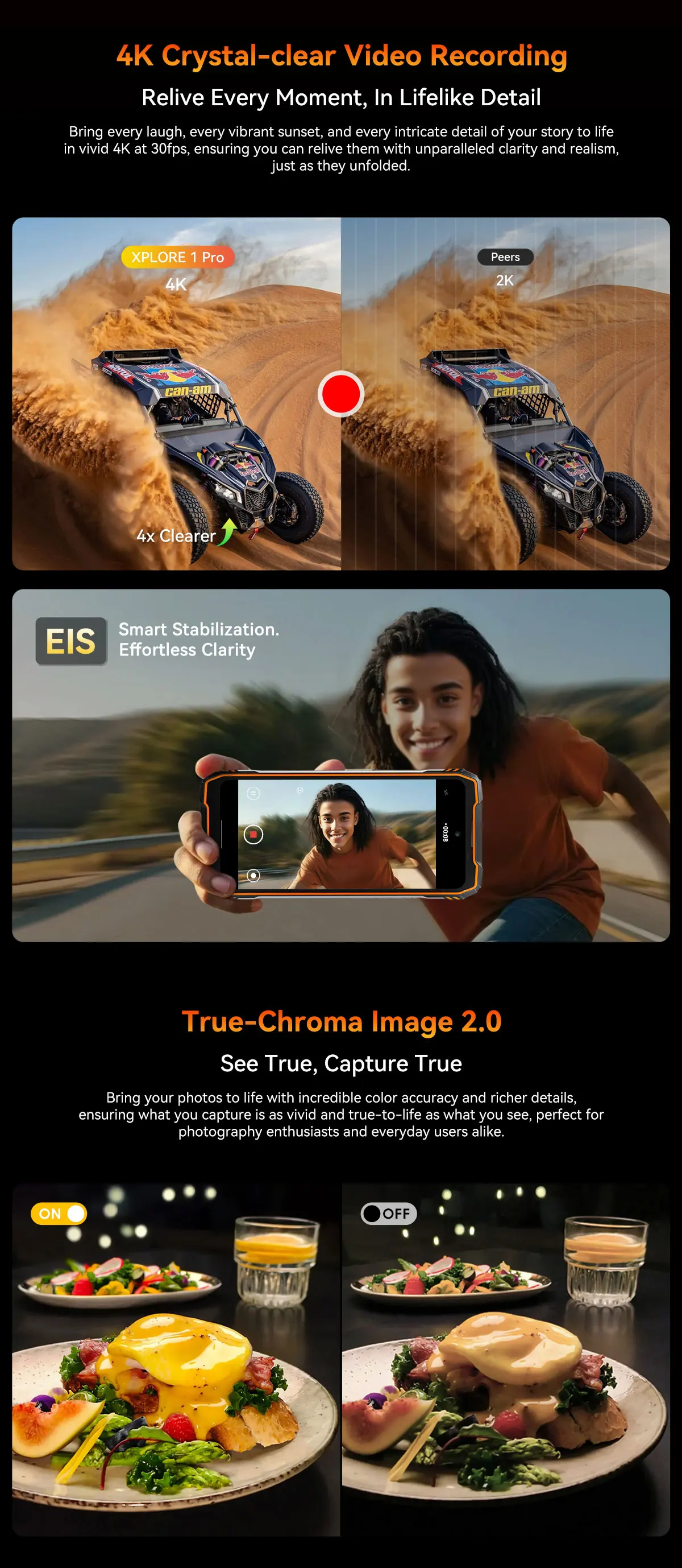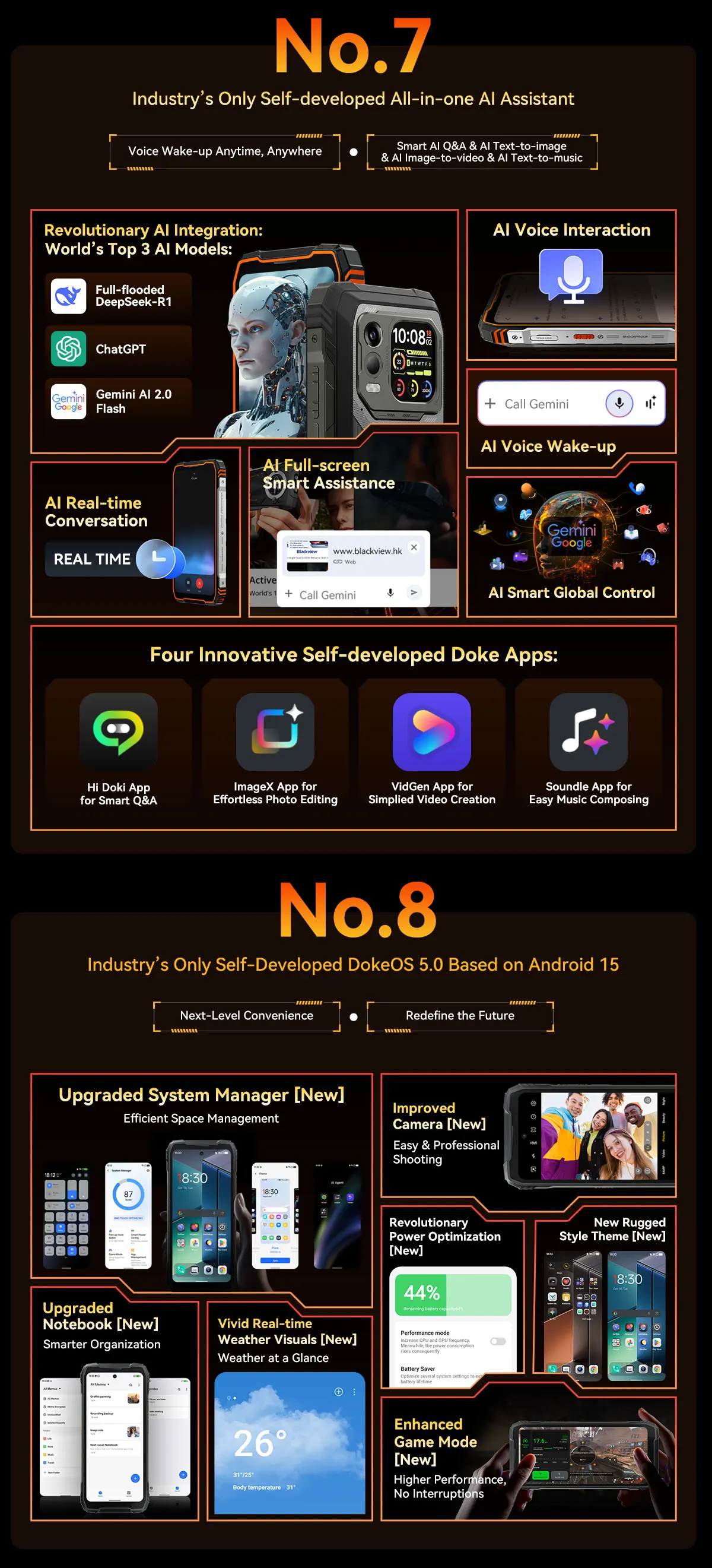 Blackview Xplore 1 Pro Portocaliu: Telefon rugged 5G, DokeOS 5.0 bazat pe Android 15. Are procesor Dimensity 7050, 16GB + 32GB RAM extensibili si 512GB ROM. Ecran principal 6.78" FHD+ 120Hz si ecran secundar 2.01". Camere puternice: 64MP + 20MP Night Vision (spate), 50MP (fata). Baterie 20000mAh cu incarcare 55W. Include camera termica FLIR, NFC, Wi-Fi 6 si protectie IP68/IP69K.