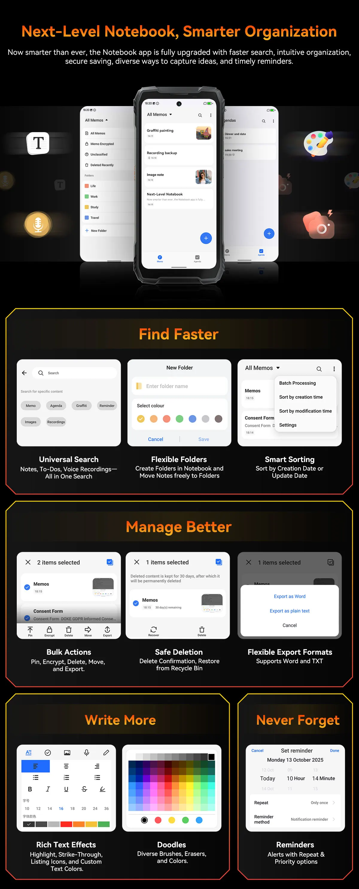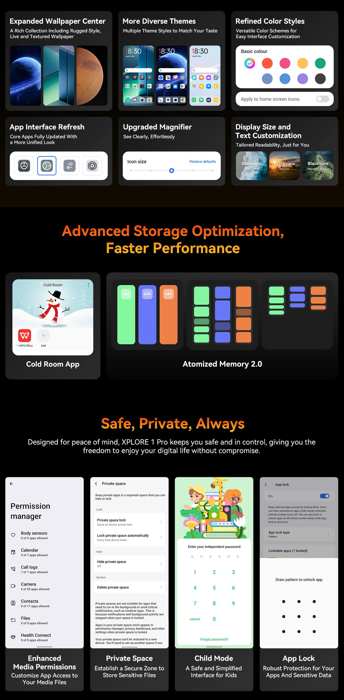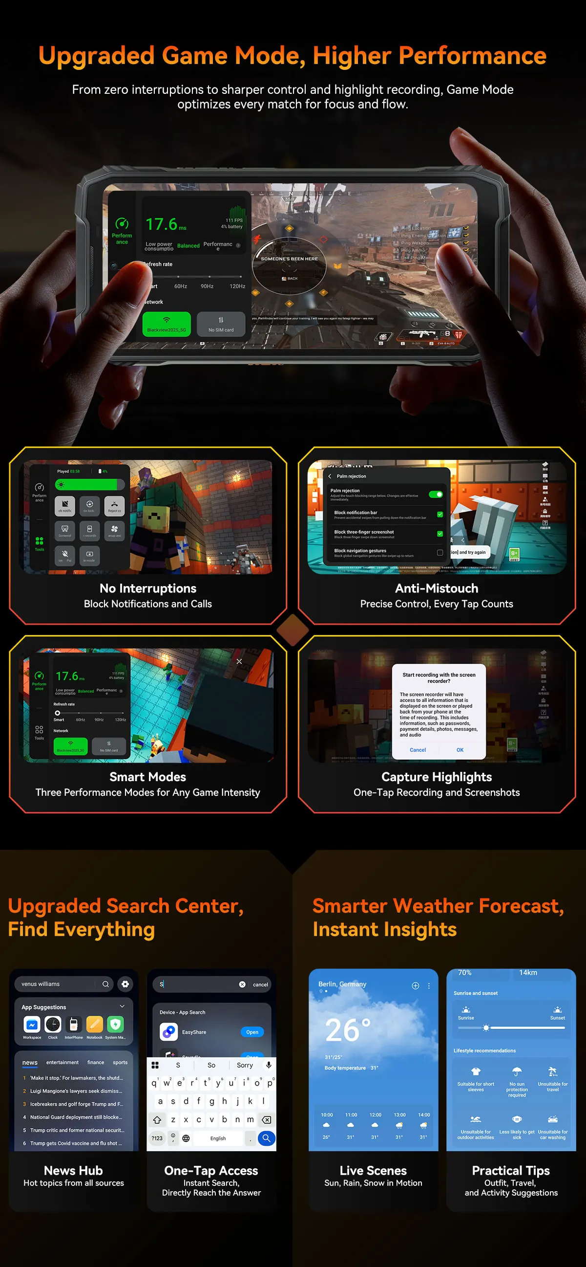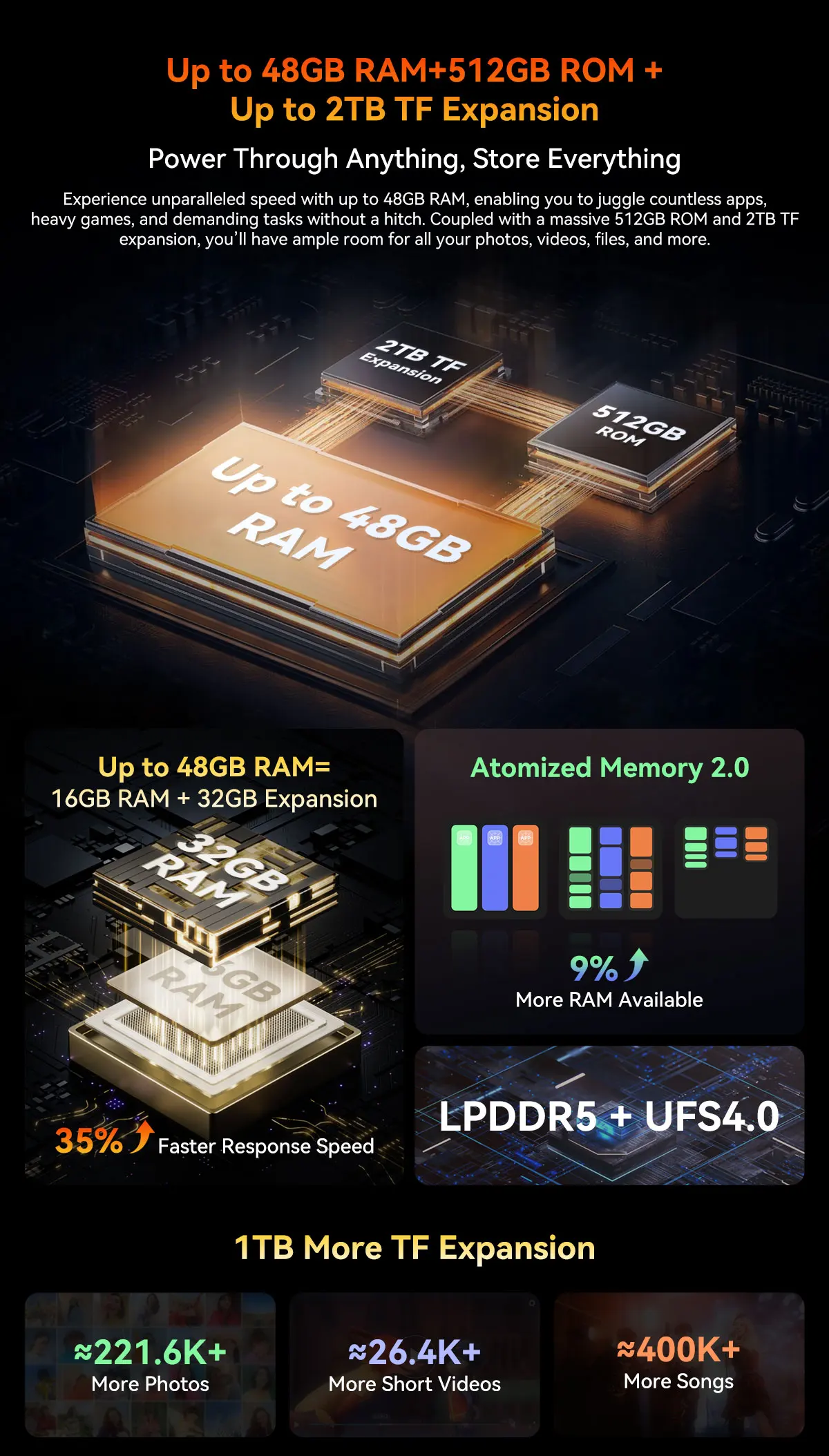 • RAM/ROM: 48GB RAM (16GB bază + 32GB extensibili), 512GB ROM (extensibil cu microSD până la 2TB).