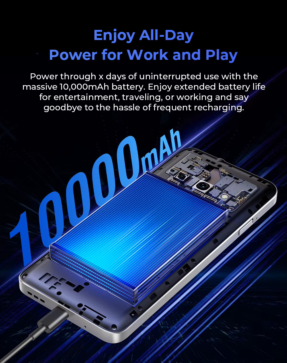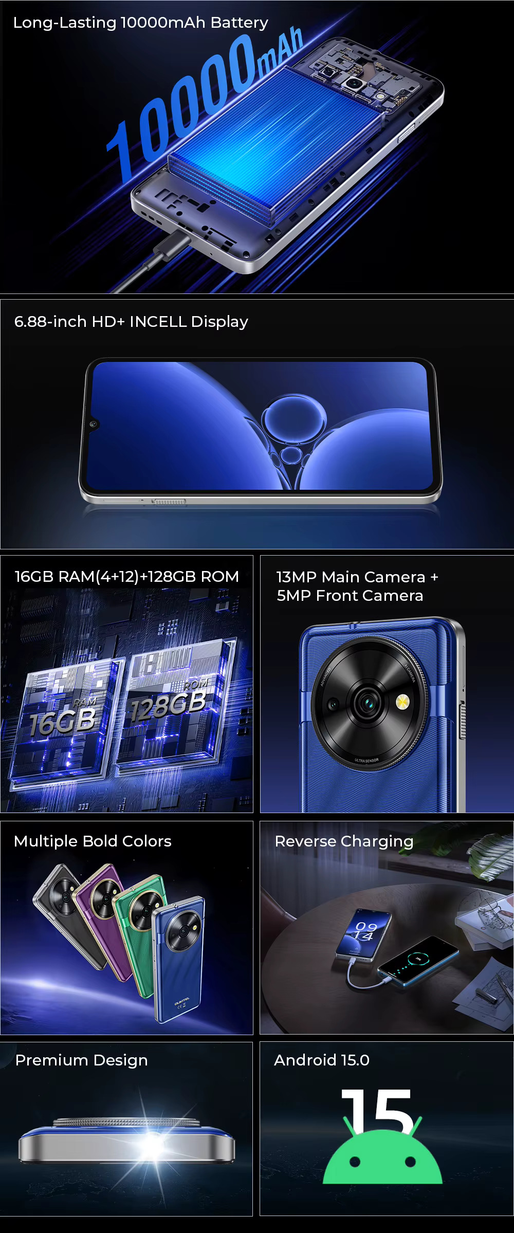 OUKITEL Telefon Mobil Oukitel C59, Albastru, 4G, 6.88", 16GB RAM (4GB + 12GB extensibili), 128GB ROM, Android 15, Unisoc T606, 10000mAh, 10W, ​​​​​​​Incarcare inversa, Dual SIM