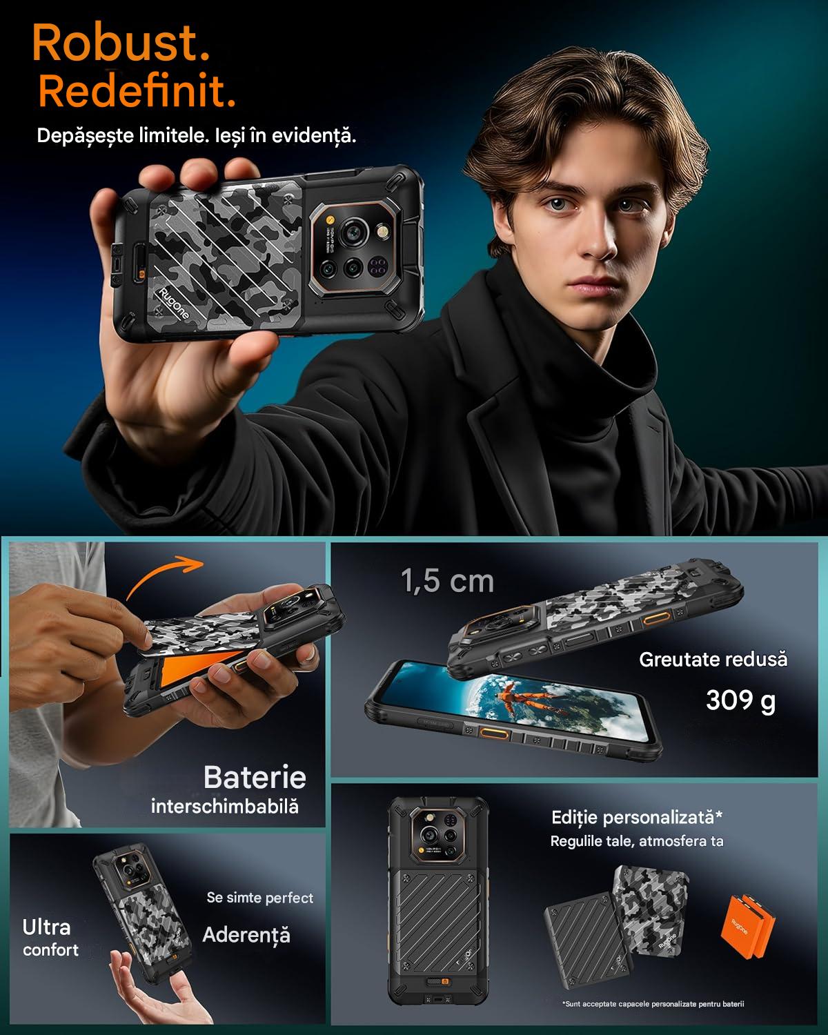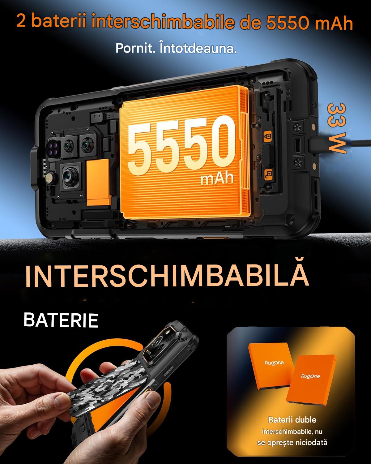 | Primul telefon rezistent din lume cu o baterie interschimbabila, incarcare rapida de 33W, incarcare inversa cu fir de 10W, motor liniar pe axa X pentru feedback haptic. | |