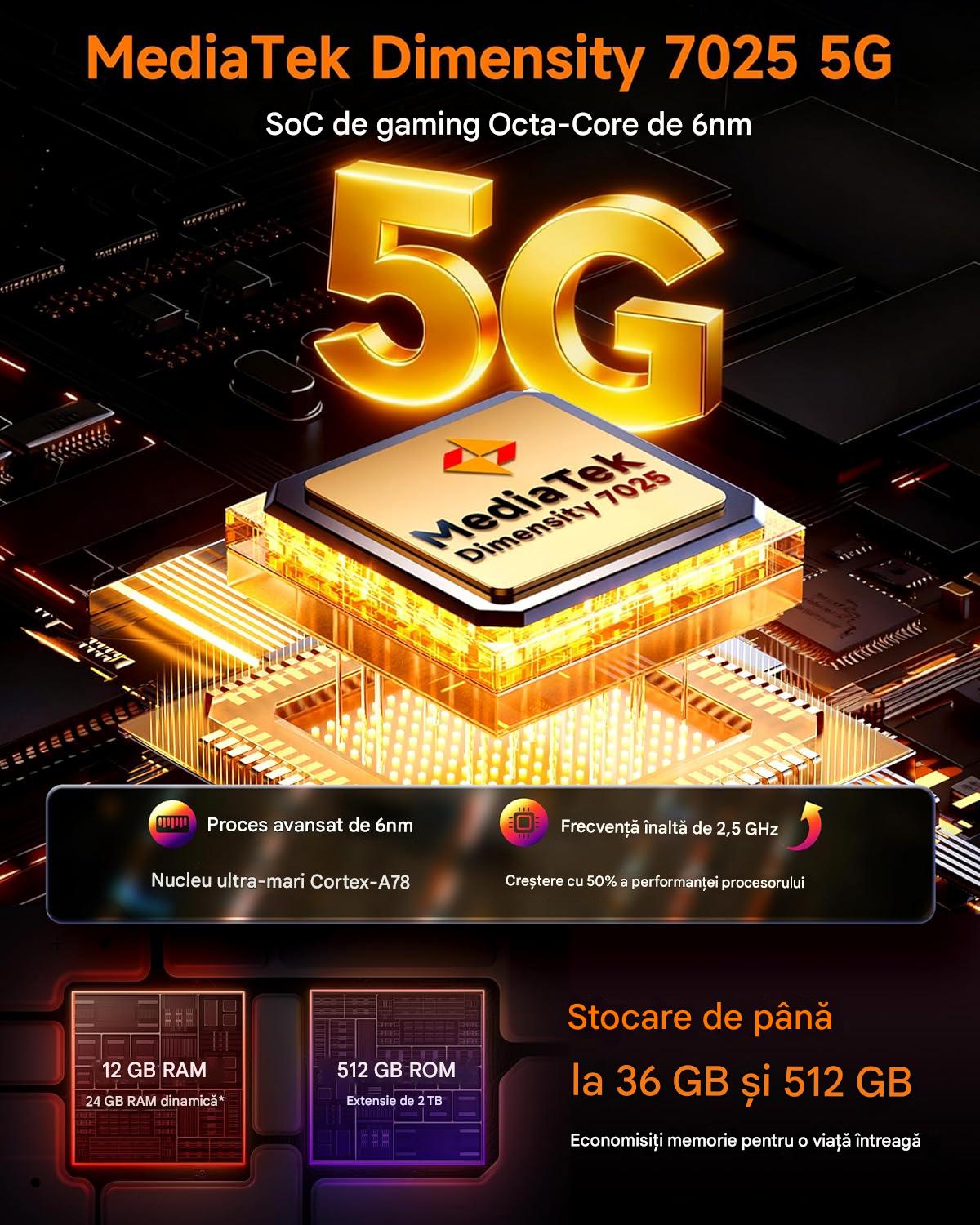 Procesor: MediaTek Dimensity 7025 (8 nuclee, până la 2.5 GHz)