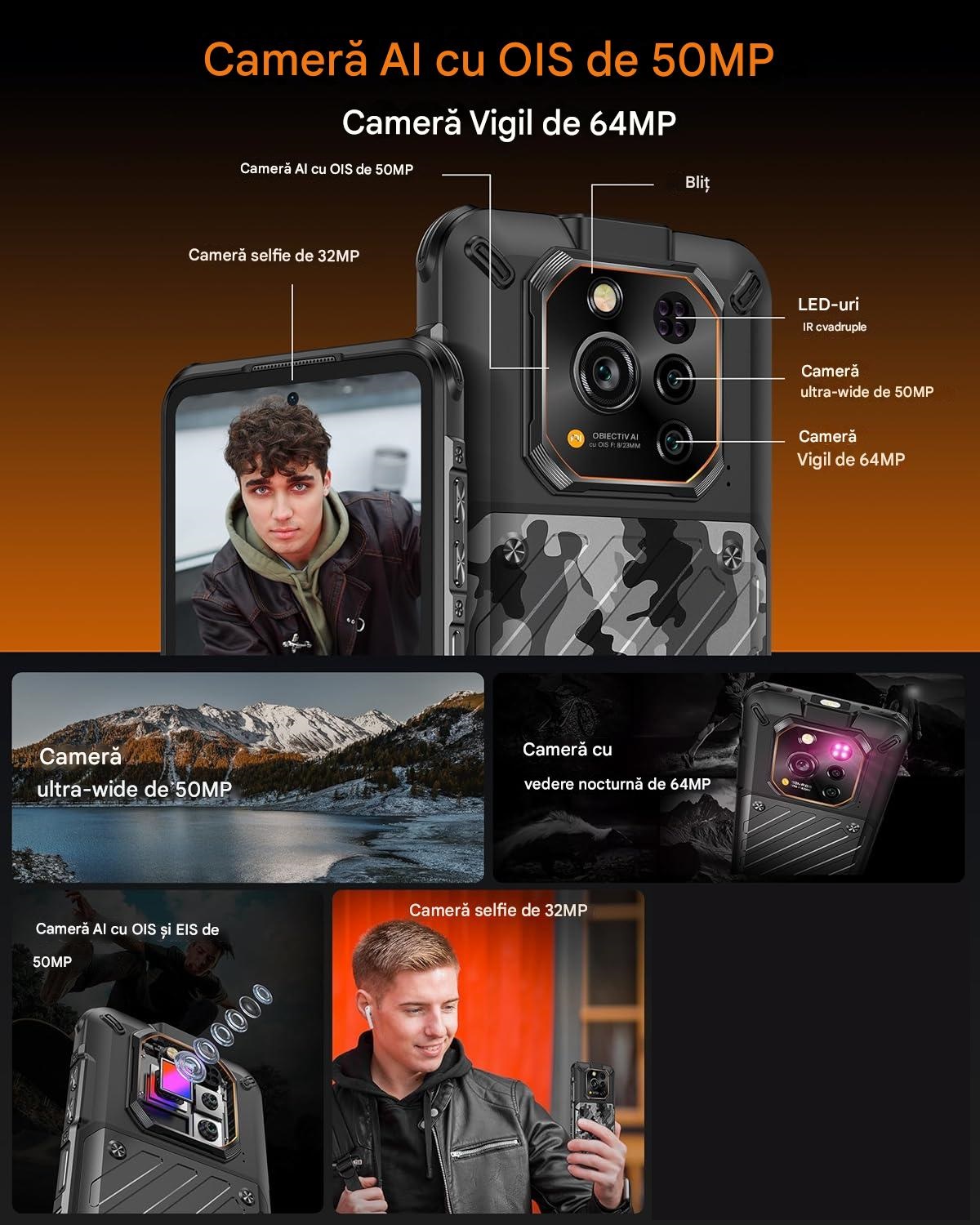 | Camere | Frontala: 32MP (sensor GalaxyCore GC32E1) Principala: 50MP (Samsung ISOCELL GN9) cu OIS Night Vision in infrarosu: 64MP cu LED-uri IR quad Ultrawide: 50MP |