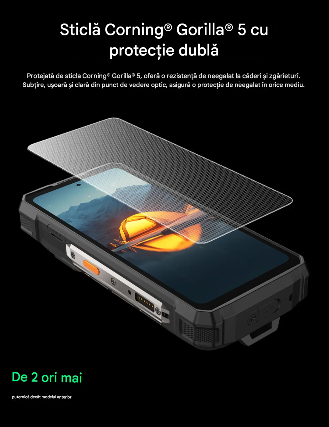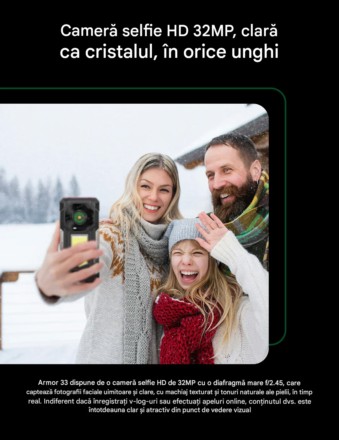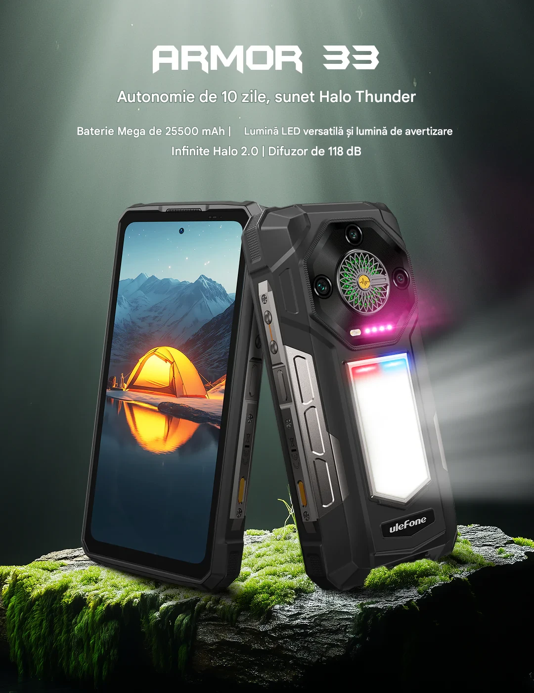 Ulefone Armor 33 Negru, are o baterie uriasa de 25 500 mAh si incarcare rapida la 66 W. Display‑ul imersiv de 6.95" FHD+ cu rata de reimprospatare de 120 Hz ofera o experienta fluida. Cameră selfie de 32 MP, camere principale: 50 MP + 64 MP noapte + 50 MP ultra‑wide. Si technologii Infinite Halo 2.0 ambient lighting si difuzor de 118 dB.