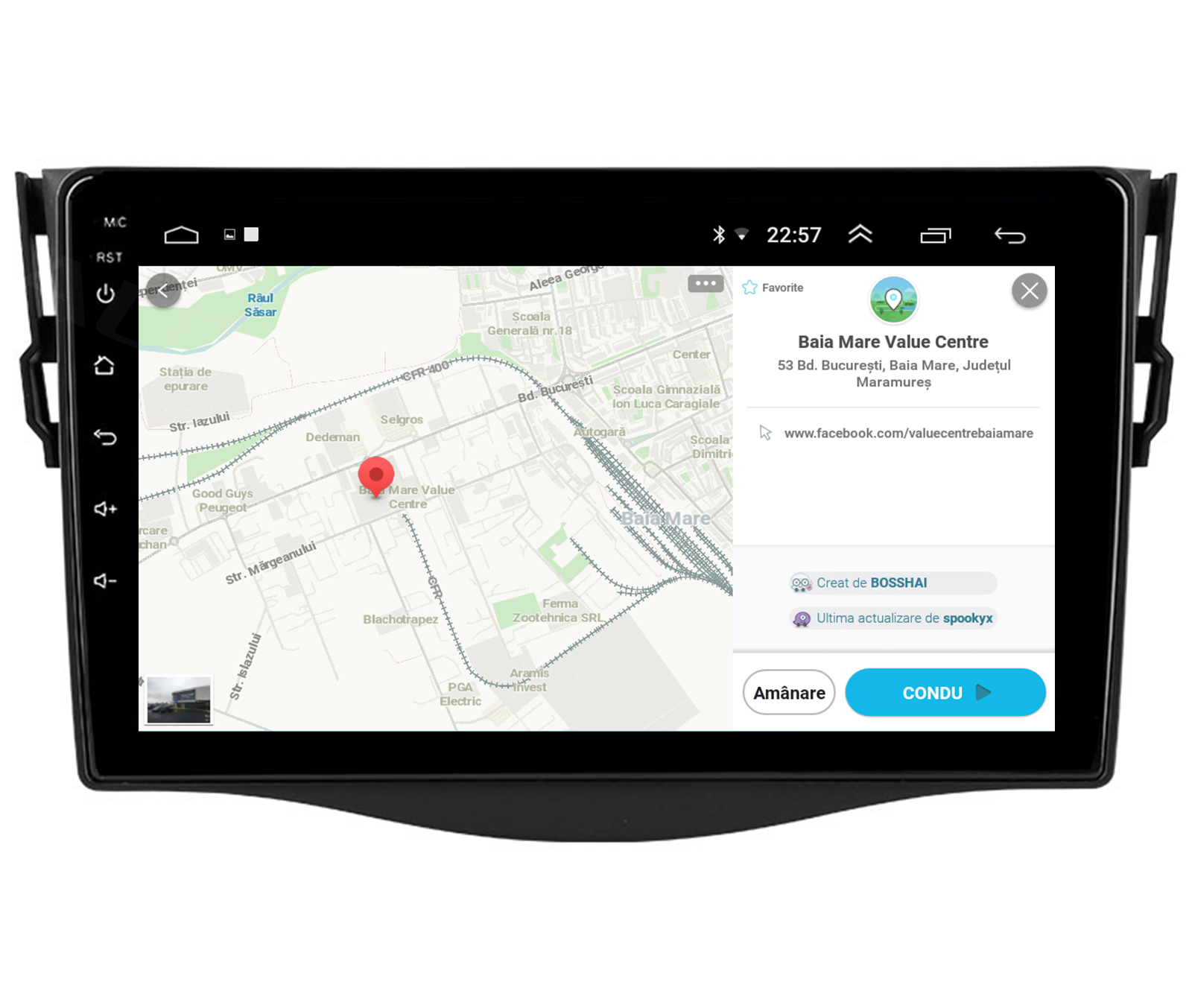 Suport online și offline pentru Navigatia GPS, susține Hărti 3D și îndrumare vocală în diverse limbi disponibile, majoritatea deja setate în limbă romană.