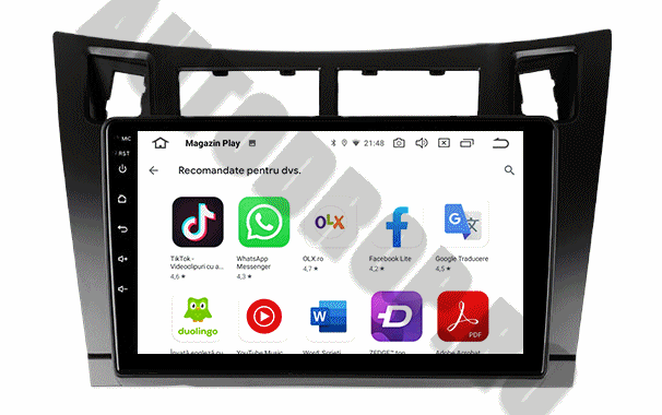 Navigație Auto Dedicată pentru autoturismul Toyota Yaris din 2005 până în 2012 cu sistem de operare Android 10, configuraţie cu 1GB RAM şi 16GB Memorie internă.